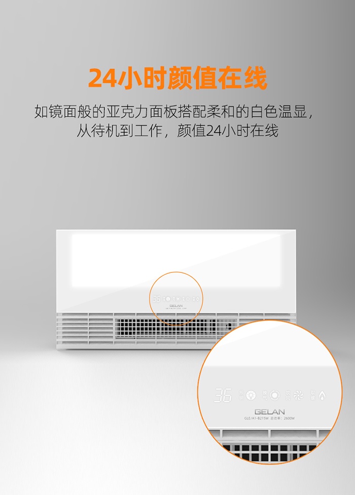智暖系列宽屏出风设计,大功率陶瓷PTC强劲供暖,空调式体验。加热器防热设计,耐高温材质应用,多层阻燃保证,告别多余担心。360°全方位的循环取暖,让暖风快速均匀的布满整个浴室,让你沐浴不再瑟瑟发抖。让室内空气快速流动,从而使浊气即刻排走,清新空气无需等待。
